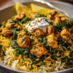 A vibrant and nourishing dish featuring turmeric-infused chicken, fluffy rice, and fresh spinach.