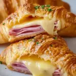 Golden-brown, flaky croissants filled with savory ham and gooey cheese, perfect for brunch or a quick snack.
