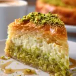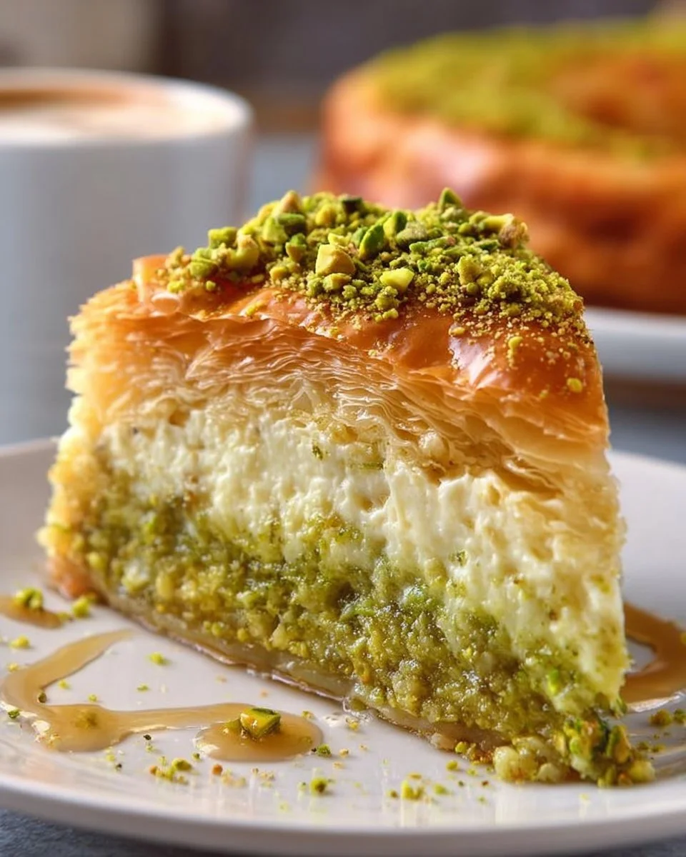 A luxurious dessert that combines the rich taste of cheesecake with the crunchy, sweet flavors of baklava and pistachios.