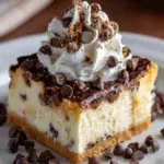 Slice and serve: Once set, lift the cheesecake out of the dish using the parchment paper. Slice into squares and top generously with whipped cream. Add extra chocolate chips and finely chopped pistachios for that delightful finishing touch.