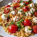 Combine Everything: Pour the dressing over the tomato and mozzarella mixture and toss gently to combine. Add the cooled orzo to the bowl and fold everything together until well incorporated.