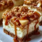 Indulge in layers of creamy cheesecake, tender apples, and buttery crust, topped with luscious caramel for a heartwarming autumn dessert.