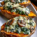 Delight in the creamy, savory goodness of mushrooms and spinach stuffed into warm, sweet potatoes, creating a perfect harmony of flavor and texture.