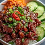 Indulging in a warm bowl of Easy Korean Beef Bowl is akin to being wrapped in a cozy blanket on a chilly evening. The moment the steam rises from this dish, it beckons you with the intoxicating aroma of toasted sesame oil mingling with the rich, savory notes of ground beef. Each bite is a delightful celebration of contrasting textures – the tender meat dances playfully with the crisp crunch of fresh veggies, while the sticky-sweet sauce envelopes everything in a luscious embrace. You experience the heat of gochujang that warms your soul, sinfully complemented by the crunch of cucumbers and the sweet snap of julienned carrots. Those who know, understand—their eyes widen at the mention of Korean flavors, imagining vibrant streets filled with sizzling vendors. This dish whispers of comfort, authenticity, and sheer deliciousness.