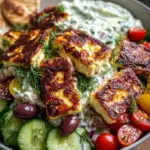 The halloumi’s alluring golden-brown crust captures your attention, hinting at the chewier, slightly springy texture within, while the sweet burst of cherry tomatoes and the satisfying crunch of English cucumber provide a perfect contrast. Add in the salty tang of Kalamata olives and the aromatic kick of fresh dill scattered throughout, and you’ve created a masterpiece that brings the best of the Mediterranean right to your dining table. Each bowl becomes a canvas, inviting you to explore a realm of flavors that not only satiate your appetite but also spark joy and delight in every bite.