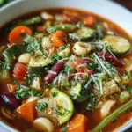A comforting and nutritious Italian minestrone soup packed with vibrant vegetables, legumes, and pasta, perfect for chilly evenings.