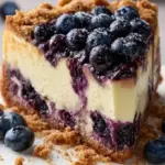 A rich Blueberry Crumble Cheesecake with creamy filling, plump blueberries, and a buttery crumble topping.