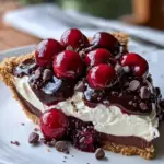 A luscious no-bake chocolate cherry cream pie featuring layers of creamy filling and sweet cherry topping, perfect for any occasion.