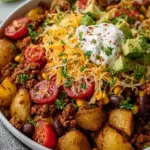 A comforting and flavorful Loaded Potato Taco Bowl filled with crispy roasted potatoes, savory meat, fresh veggies, and creamy toppings.