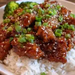 7. Serve and garnish: Spoon the chicken over rice or noodles and garnish with sesame seeds and sliced green onions.