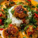 Delicious Thai chicken meatballs bathed in a rich coconut curry sauce, delivering comfort and vibrant flavors in every bite.