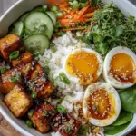 - Assemble the bowls by dividing warm rice between two bowls, adding fresh greens, sliced cucumber, julienned carrot, golden tofu, and halved jammy eggs.