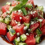 A refreshing summer salad featuring juicy watermelon, crunchy cucumber, and tangy feta cheese drizzled with balsamic glaze.